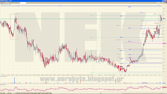 Η μετοχή έληξε 3 με αναλογία 261.8% του 1 διόρθωσε μέχρι λίγο πιο πάνω από το 38.2% και ξεκίνησε για το 1-2 της επόμενης κίνησης ενώ τώρα δείχνει να είναι στο 3 ανοδικό του εξωτερικού 5.