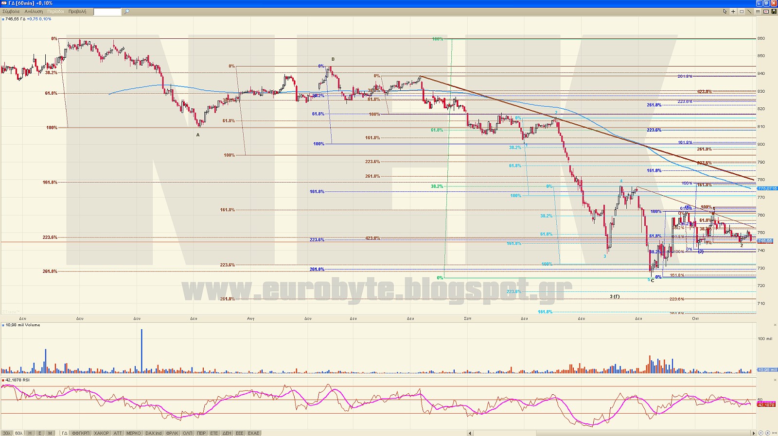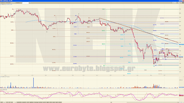 Ξεκίνησε το 1 της νέας κίνησης ((1) μπλε) με ένα 5κυματικό και ένα νέο 1-2 (του 3) δηλ της επόμενης κίνησης  και είμαστε στη φάση 2 του 1 του 3 το οποίο κανονικά θα πρέπει να σταματήσει  είτε εδώ είτε στο 740.57 κατ’ελάχιστο. Ανοδικός στόχος είναι το 777 όπου βρίσκεται η ισότητα του εξωτερικού μπλε 3 και πιθανότατα Δευτέρα-Τρίτη να αναμετρηθεί και με τη γραμμή τάσης (καφέ) που τείνει και αυτή στο ίδιο σημείο το διήμερο.