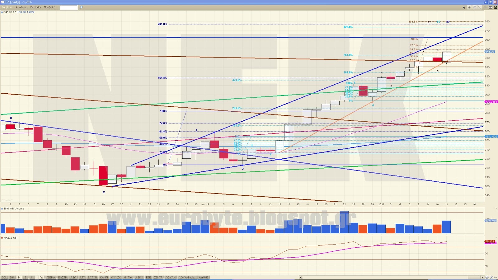 Βρίσκεται σε κύμα 5 το οποίο λήγει με 61.8% του 1 στα 2.01 ευρώ (μπλε φίμπο) και κουμπώνει και το εσωτερικό 3 στο ίδιο σημείο με 261.8% του 1 (γαλάζιο φίμπο) όπου εκεί πιθανόν να κάνει 2-πλη κορυφή λήγοντας και το εσωτερικό 5 στο ίδιο σημείο.