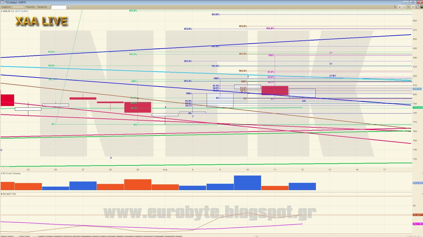 Η συνέχεια, δεδομένων και των θετικών κλεισιμάτων των ξένων χθες αναμένεται να είναι ανοδική με κόντρα στο 8.20 (γραμμή καναλιού) και ενδιάμεσο ξανά το 814.20. Από κάτω έχουμε σημαντικό σημείο το 799 όπου κάνει retest της καθ.γραμμής τάσης που έσπασε πάνω χθες καθώς και το χθεσινό γκαπ στο 801.18.