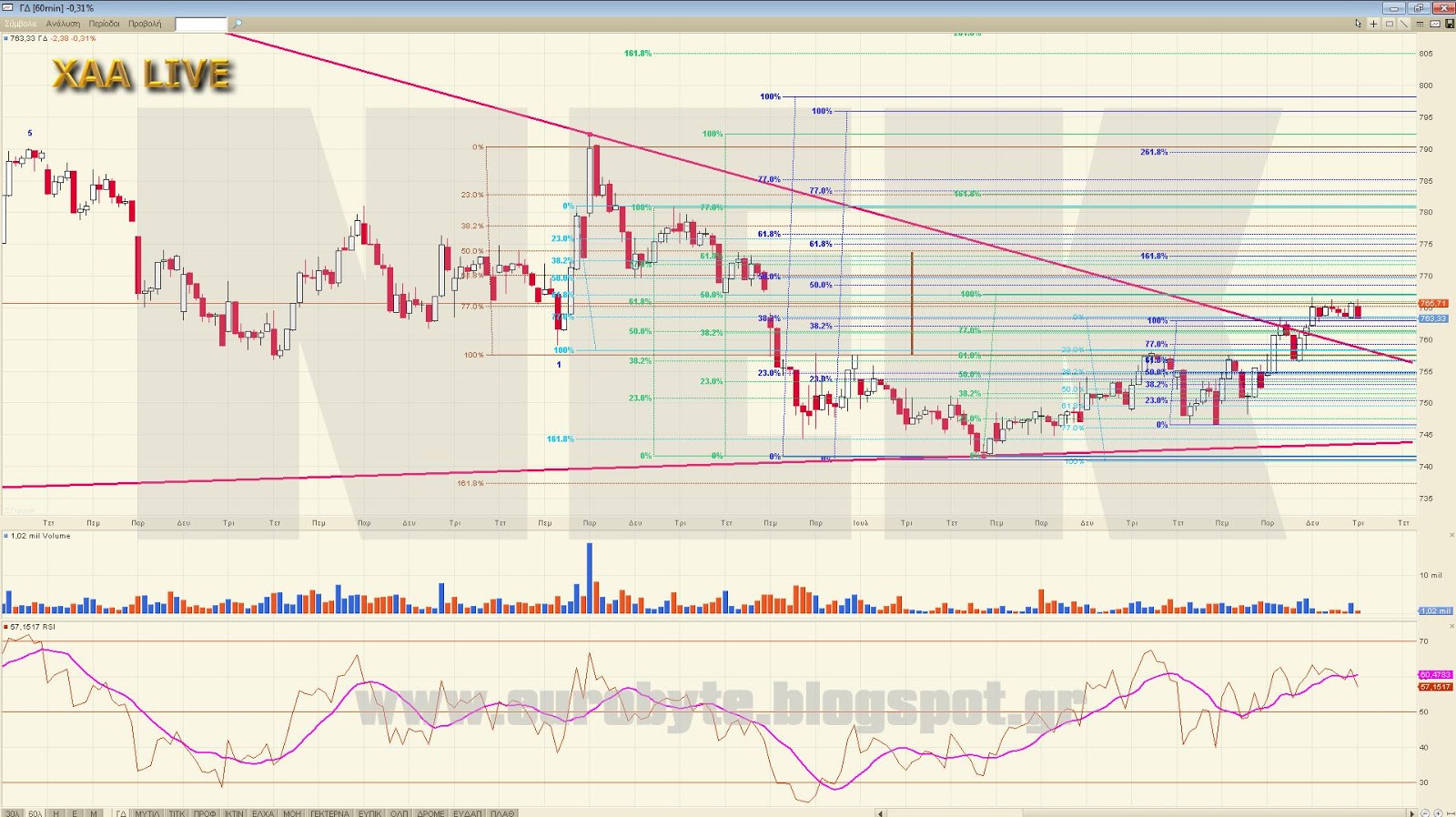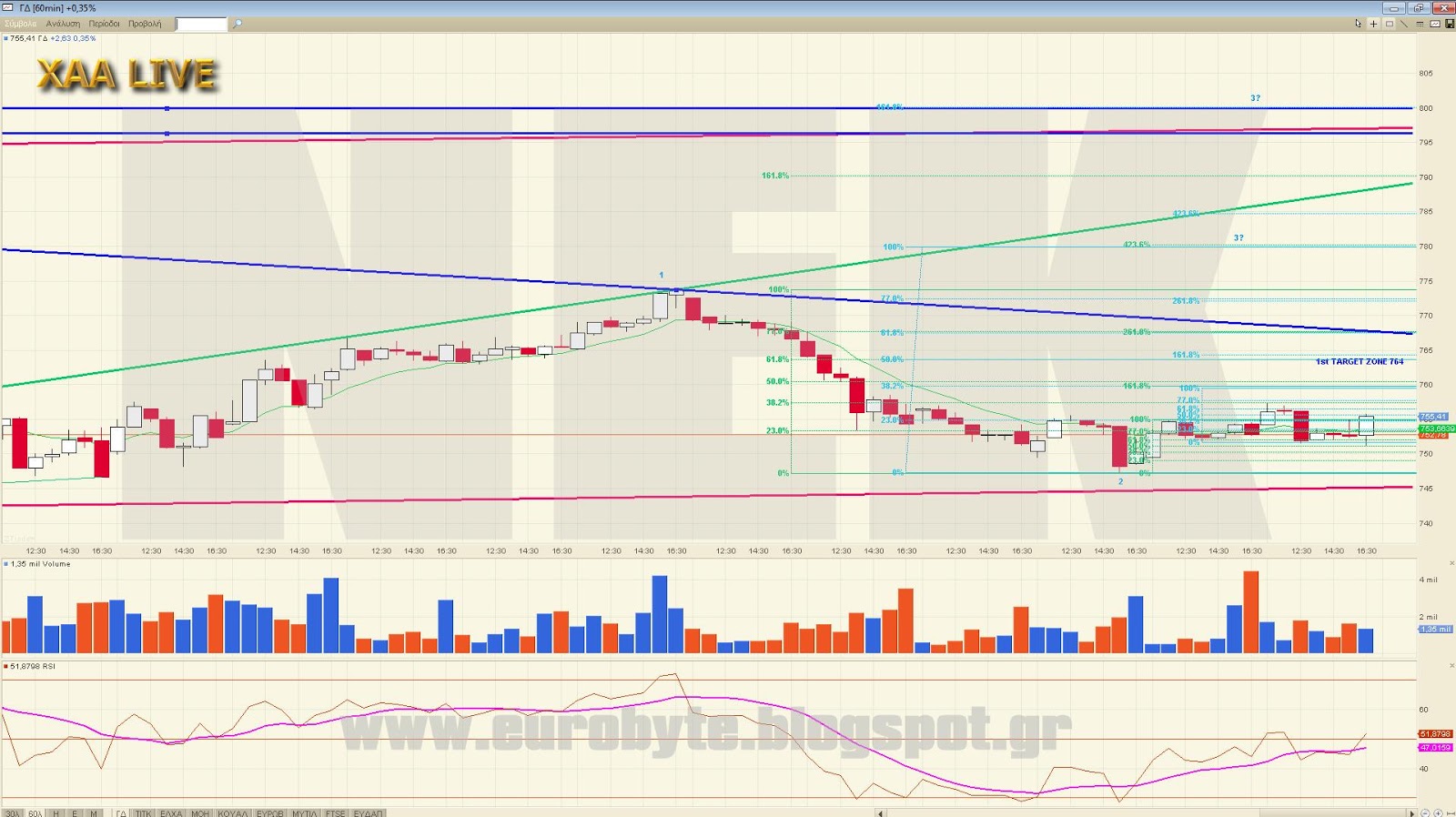 Ο ΓΔ σε περίπτωση που εδώ έληξε κύμα 3 και πάει σε διόρθωση έχει τα εξής 2 σημεία: 763 με 4=38.2% του 3 και 760 με 763 με 4=50% του 3. Αν συνεχίσει ανοδικά το κύμα 3 τότε η επόμενη αναλογία του είναι στο 790 όπου 3=261.8% του 1. Για να γίνει αυτό θα πρέπει να κρατήσει την γρήγορη γρ.τάσης στο 769.