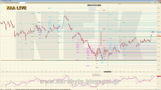 O DAX κινήθηκε ήδη ανοδικά προς την ισότητα του εξωτερικού δηλ προς το 12824 που δώσαμε χθες με πιθανότητα 80% ενώ στη συνέχεια είναι αρκετά πιθανό να κινηθεί προς την επόμενη εσωτερική αναλογία του 161.8% στις 13000 μονάδες αφού πρώτα σταθεί στην ισότητα του εσωτερικού στις 12950! Δηλαδή αν διασπάσει ανοδικά το 12825 έχει μεγάλες πιθανότητες να πάει για τοπική κορύφωση στη ζώνη 12950-13000. Στο 60λεπτο ωστόσω έχουμε μια διαφωνία στις κορυφές που μπορεί να τον οδηγήσει και σε διόρθωση σήμερα. Οι πιθανότητες όμως είναι υπέρ της συνέχισης της ανοδικής πορείας παρόλη την διαφωνία.