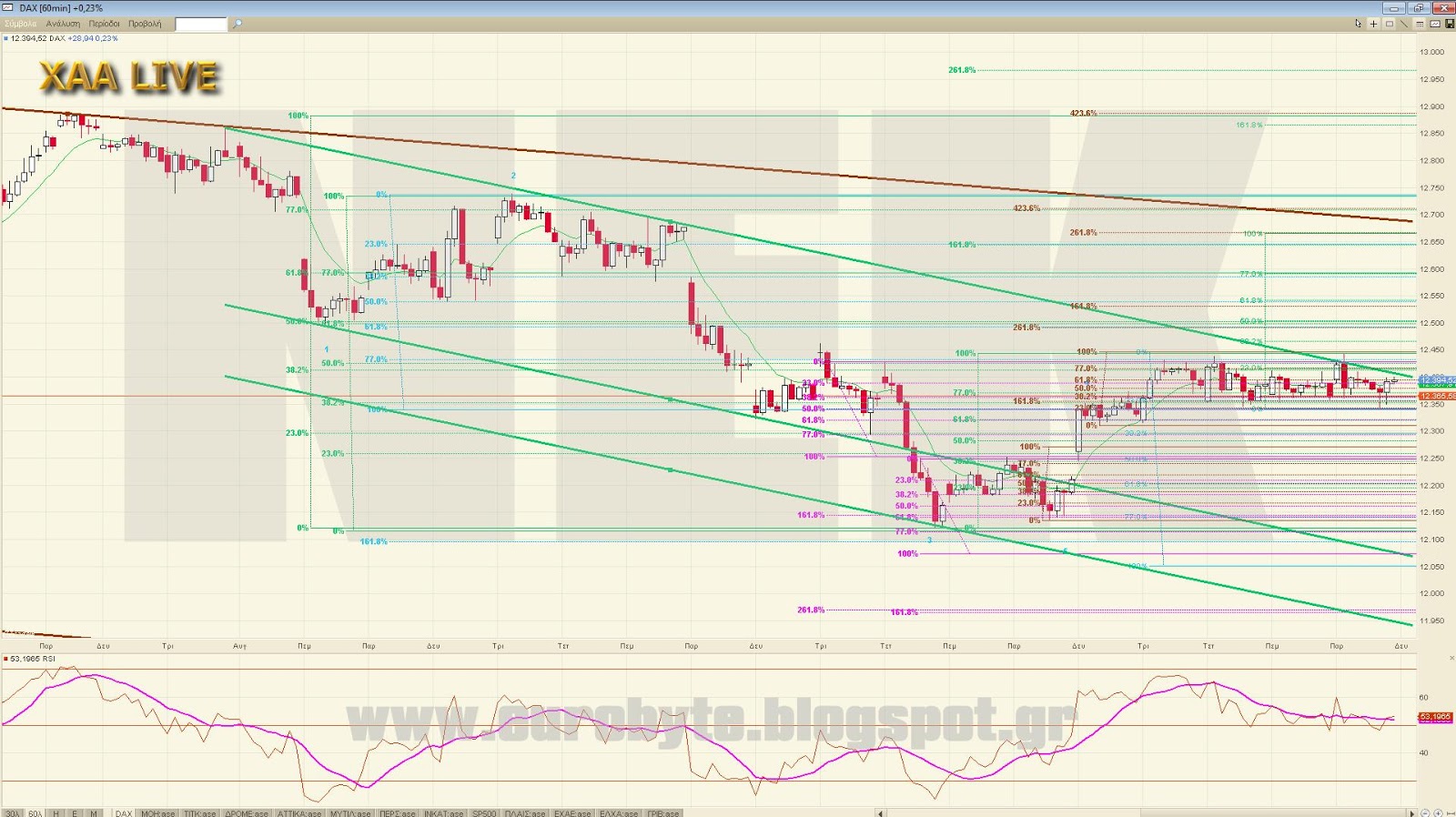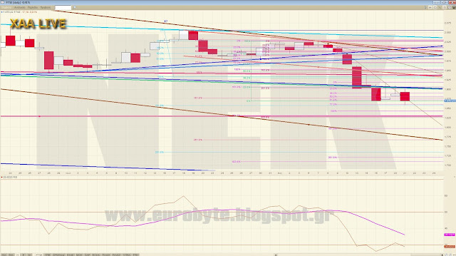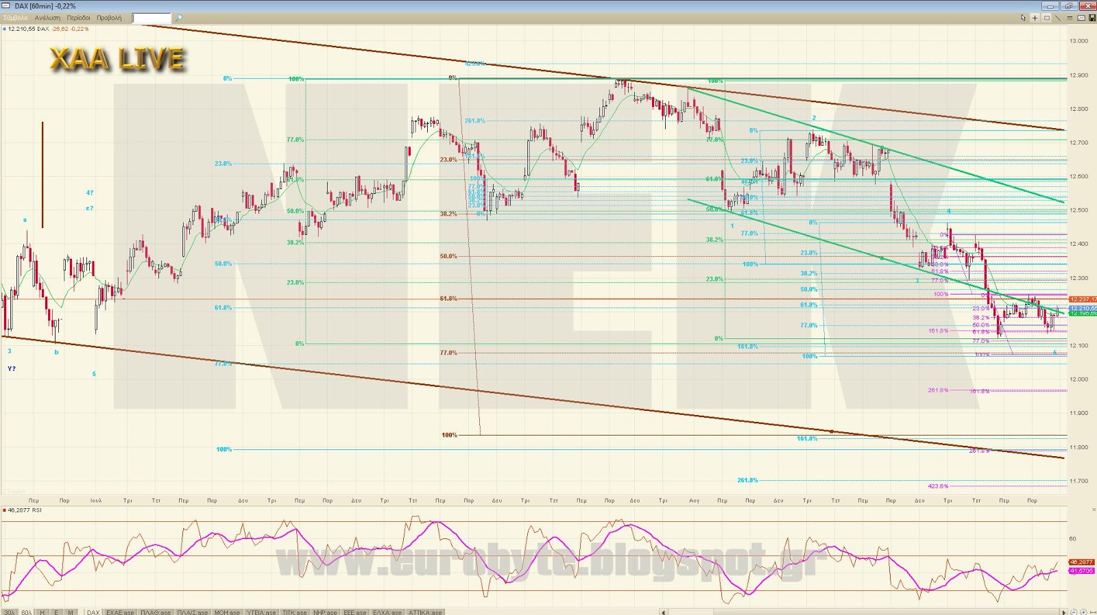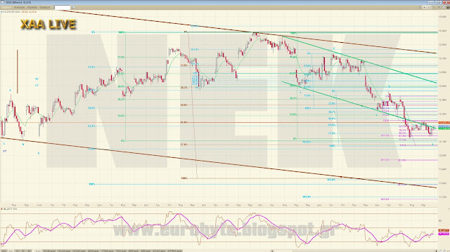 Ο DAX έκανε μια αποτυχημένη απόπειρα διάσπασης της καθοδικής γραμμής τάσης σε 60λεπτο και είναι πιθανό να ξεκινήσει το κύμα 5 με στόχο είτε τις 12050 με ισότητα είτε τις 11805 με 161.8% όπου κουμπώνει και η ισότητα της εξωτερικής αναλογίας στην ίδια περιοχή ή ακόμα και με το δεδομένο ότι το ανοδικό του μπορεί να θεωρηθεί και 5κυματικό να πάει μέχρι το 61.8% του ανοδικού ως κύμα 2 στις 12244. Τέλος, από πάνω η κατερχόμενη βρίσκεται στο 12400 και μόνο έγκυρη διάσπαση αυτής μπορεί να δώσει υψηλότερα νούμερα. Αν τυχόν ο δείκτης γράψει πάνω από 12493.20 τότε το τρέχον κύμα δεν είναι 4 αλλά ανοδικό προωθητικό και βάζει πλώρη για το επόμενο επίπεδο των 12665 μονάδων με ισότητα 3=1 όπου θα βρίσκεται και η κύρια κατερχόμενη σε 60-λεπτο τις επόμενες ημέρες.