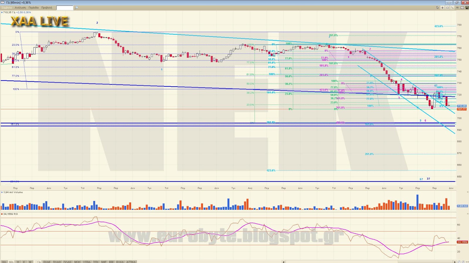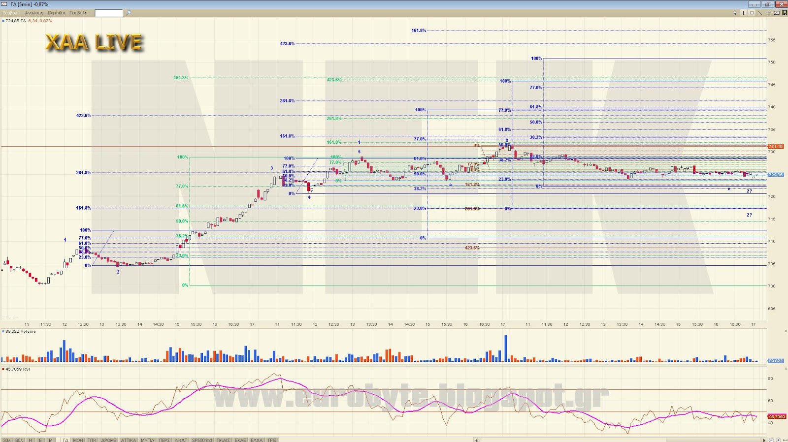 Από κάτω έχουμε διαδοχικά τα 724, 719.30 και 712 που είναι το 23%, 38.2% και 61.8% αντίστοιχα του ανοδικού από ημερήσιο. Λόγω του ότι σε 5λεπτο η υπέρβαση προς τα υψηλά δεν εντάσσεται στο 5κυματικό αλλά είναι κύμα Β με expanded flat υποχρεώνει να έχουμε στο νου μας και τα σημεία από το 5λεπτο ως πιο σωστά στη μέτρηση. Αυτά είναι: 711 (2=61.8% του 1), 718 (2=38.2% του 1) και το 722 (2=23% του 1)