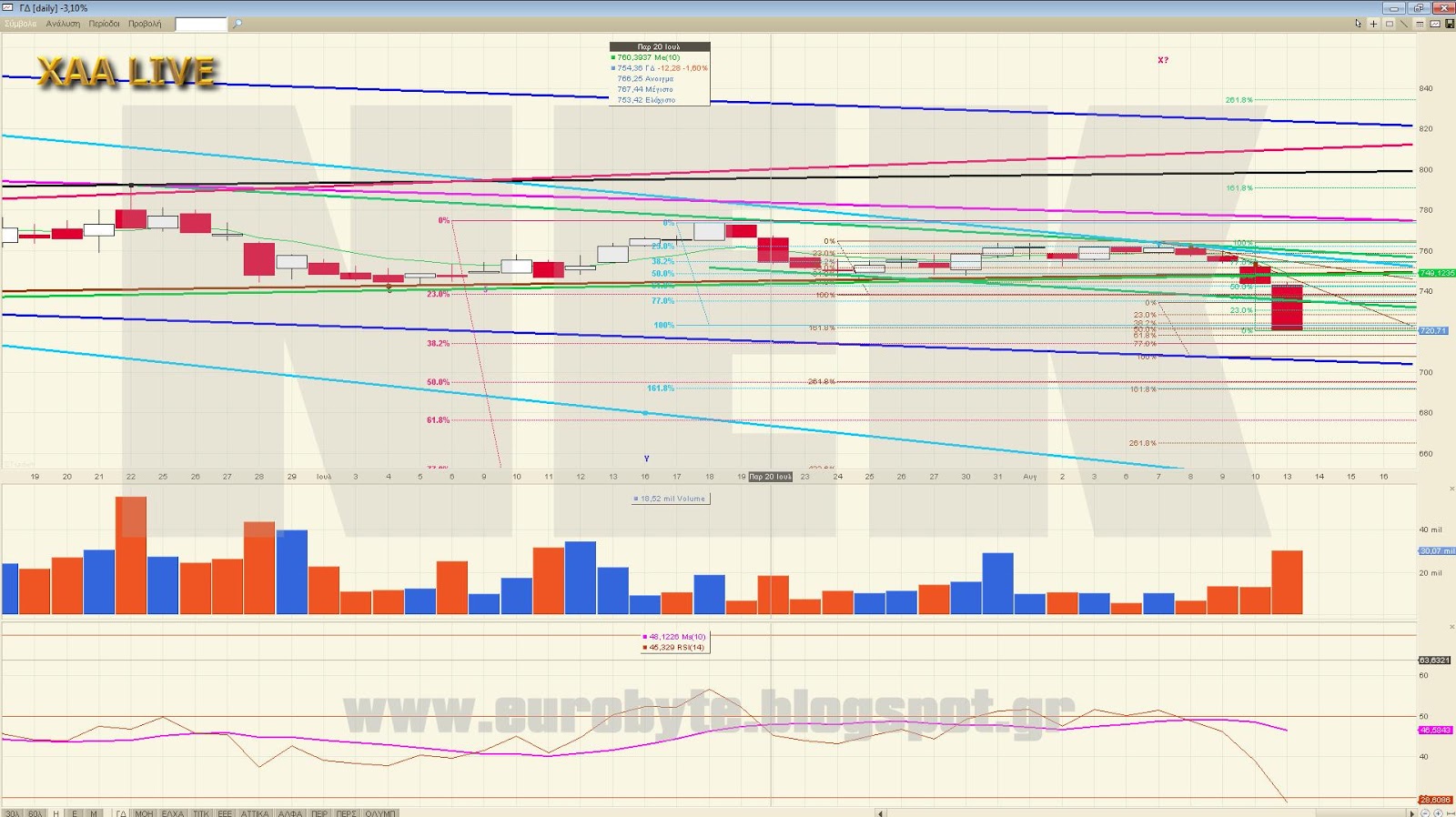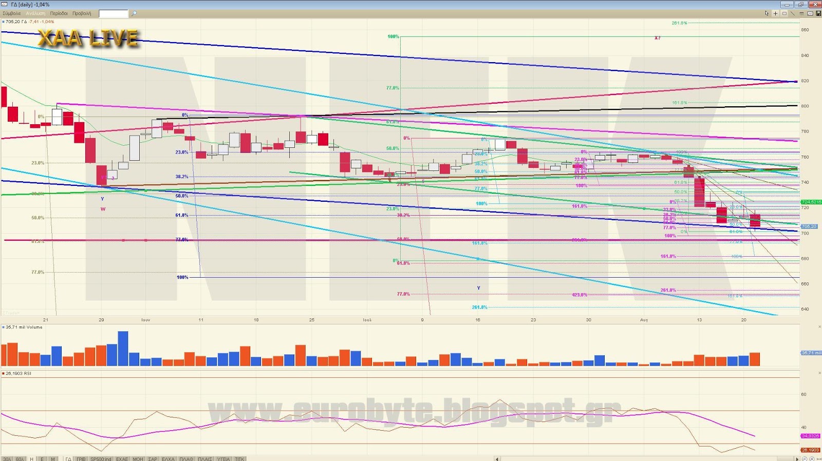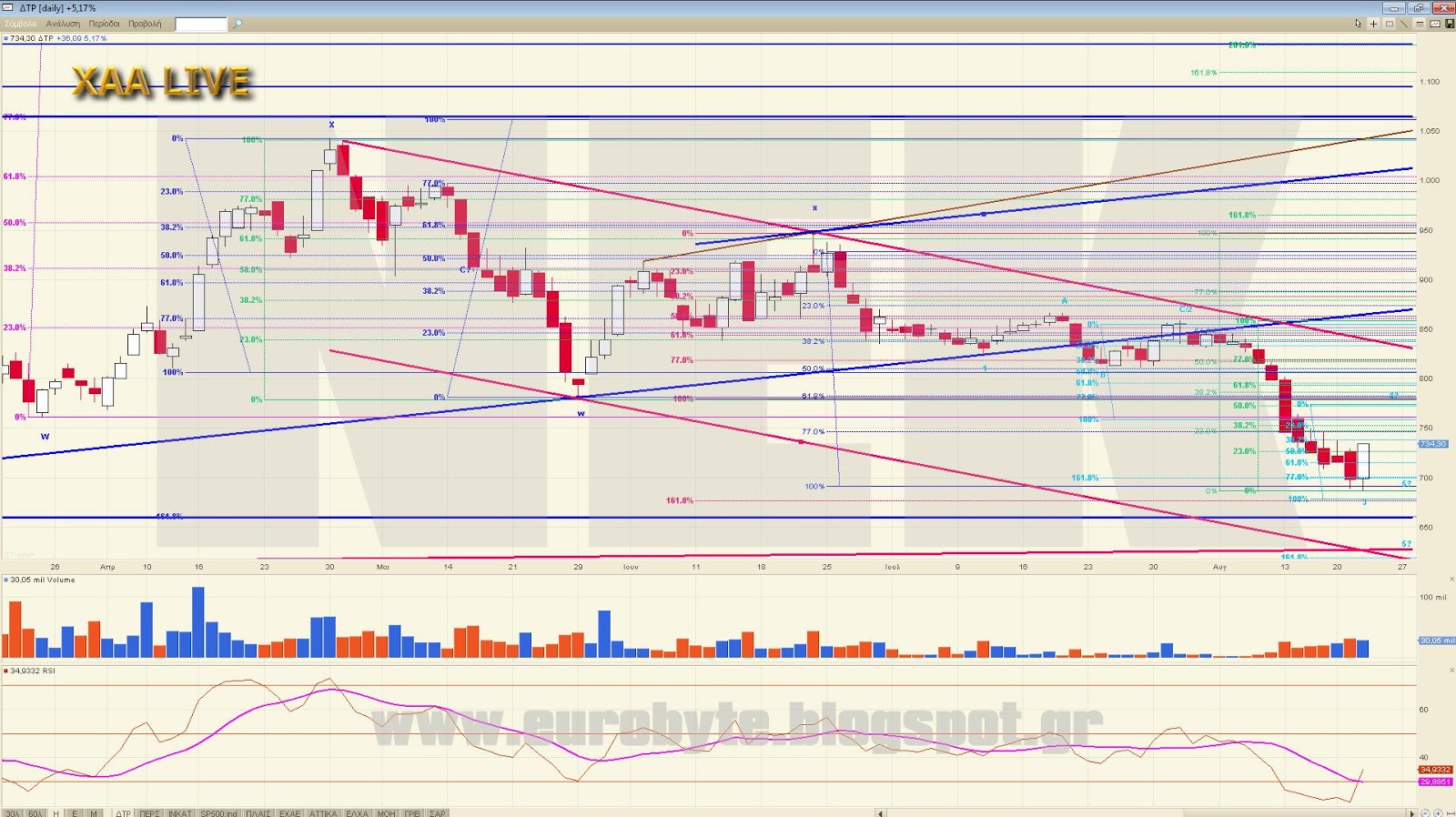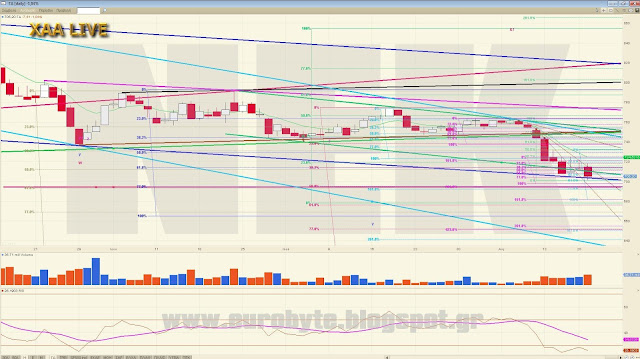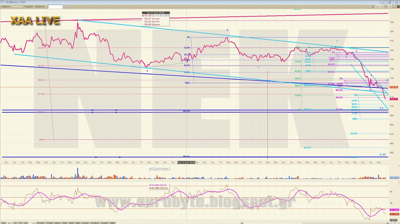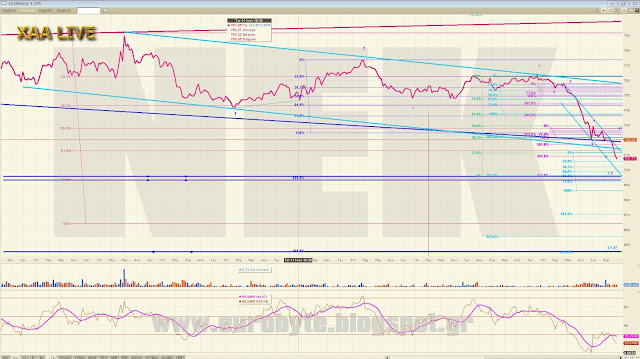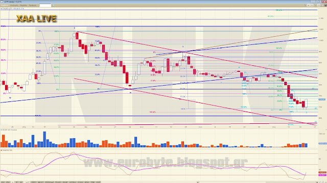 Ένα από τα σενάρια που παίζει για παράδειγμα είναι να διορθώνουμε ανοδικά την κίνηση από τις 792.37 (w) κάνοντας ένα ανοδικό x με στόχο τις 746 μονάδες. Αυτό όμως προϋποθέτει να κινηθούμε με συγκεκριμένο τρόπο ο οποίος είναι ο εξής (από 5λεπτο): Αρχικά διόρθωση μέχρι το 717 όπου θα λήξει ένα εσωτερικό C με C=262% του Α σε 5λεπτο και μετά με ισότητα του όλου ανοδικού να γραφτεί το 746, απ’όπου ενδεχόμενα θα πάμε σε νέα χαμηλά. Σαφώς και υπάρχουν και άλλα σενάρια εξαρτώμενα από το βάθος του διορθωτικού που είναι σε εξέλιξη.
