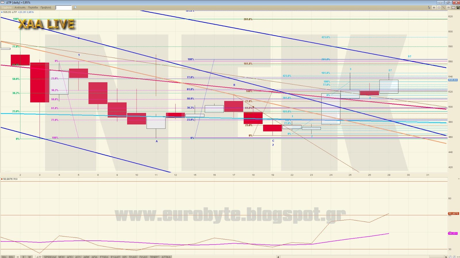 Ο ΔΤΡ ολοκλήρωσε το τελευταίο ανοδικό από τις 462.06 με 5 κυματικό (5-161.8% του 1) ενώ αν θέλει μπορεί να δει και το επόμενο επίπεδο, αυτό των 563 μονάδων με 5=261.8% του 1, το οποίο κουμπώνει και με την εξωτερική αναλογία ισότητας από το 1ο ανοδικό. Στη ζώνη αυτή βρίσκεται και η γρ.τάσης (560) και αποτελεί το 560-566 μία ζώνη ισχυρής αντίστασης.