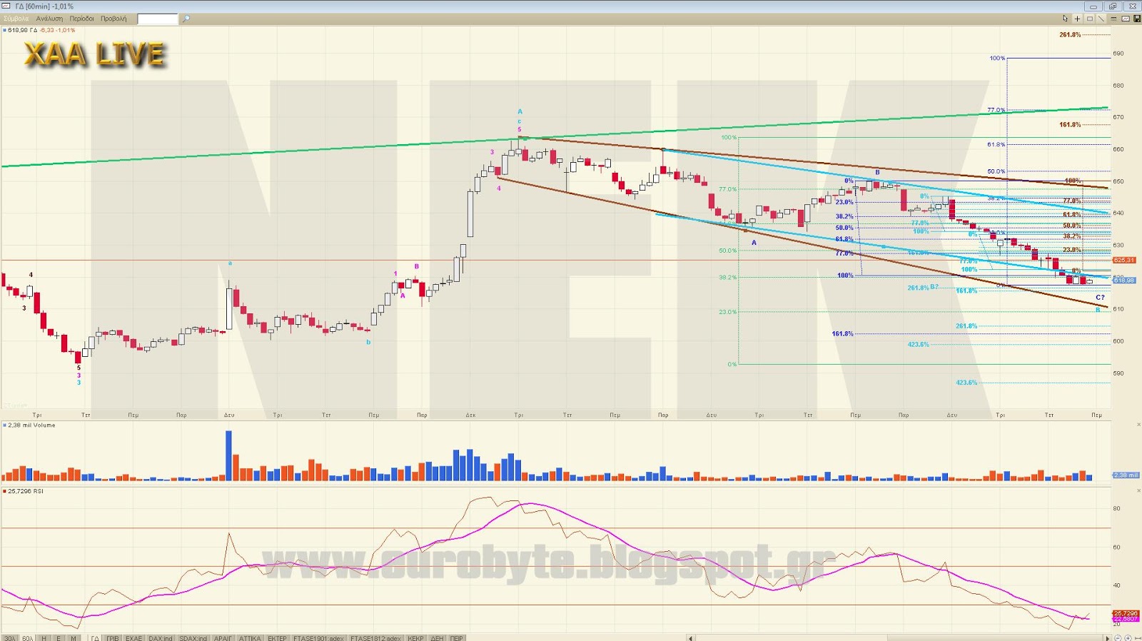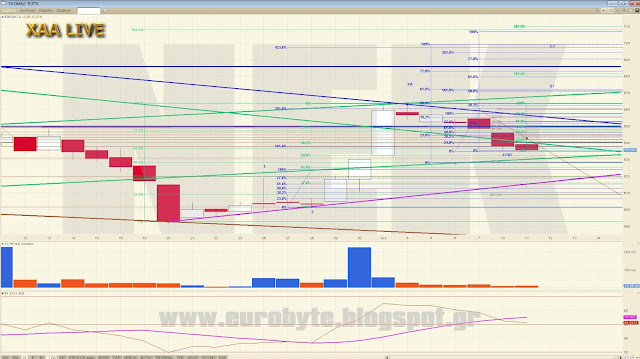 Η ισότητα του καθοδικού μας πάει στο 620 (από το οποίο πλέον απέχουμε μια ανάσα) το οποίο παράλληλα είναι και το 61.8% του όλου ανοδικού. Το παρόν σενάριο αναφέρεται καθημερινά από όταν ήμασταν στις 664 μονάδες και δείχνει να ακολουθείται με ευλάβεια.