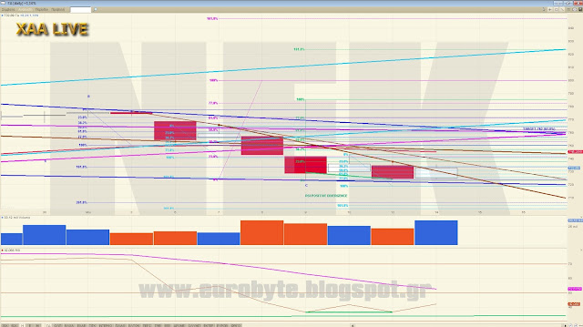 Να σημειωθεί επίσης ότι η παράλληλη γραμμή καναλιού με αυτήν που ενώνει τα 1 με 3 της κίνησης σε ΓΔ εβδομαδιαίο την επόμενη εβδομάδα είναι στο 713, πράγμα που αφήνει ανοικτό το ενδεχόμενο να δοθεί αντίδραση από το 738-742 και μετά το πέρας της να οδηγηθούμε στο 38% του 3 δηλ στις 713 μονάδες.