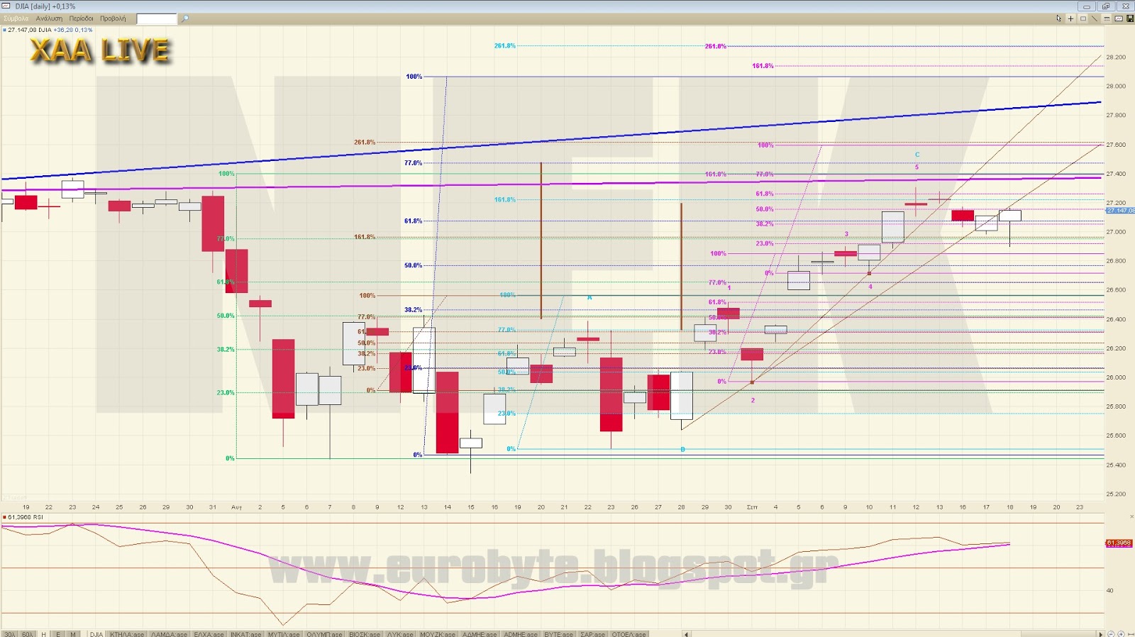 Τόσο ο DAX όσο και ο DOW υπάρχει περίπτωση να έχουν λήξει σχηματισμό ΑΒΓ στο υψηλό με απόλυτα ακριβείς αναλογίες φίμπο. Πιθανολογείται η καταγραφή ενός ελαφρώς νέου υψηλού προκειμένου να δοθεί και η διαφωνία στον rsi στις κορυφές και κατόπιν καθοδικό γύρισμα. Απαιτείται μεγάλη προσοχή τις επόμενες ημέρες.