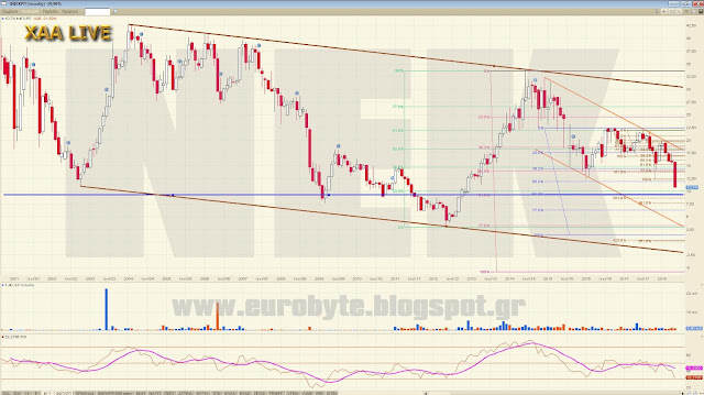 Αν δεν κρατήσει την μπλε οριζόντια γραμμή στο 9.30 (9.42 σε ημερήσιο) που αποτελεί το 61.8% του τελευταίου καθοδικού και το 61.8% του πρώτου καθοδικού καθώς και τη στήριξη 8.75, τότε είναι αρκετά πιθανό να κινηθεί προς τα προηγ. χαμηλά στα 3.10 όπου είναι και το 77% από την εξωτερική αναλογία. Πριν από αυτό τα 5 ευρώ είναι το 77% της εσωτερικής αναλογίας και άλλο ένα πιθανό σημείο για να σταθεί σε περίπτωση συνε΄χισης της πίεσης.
