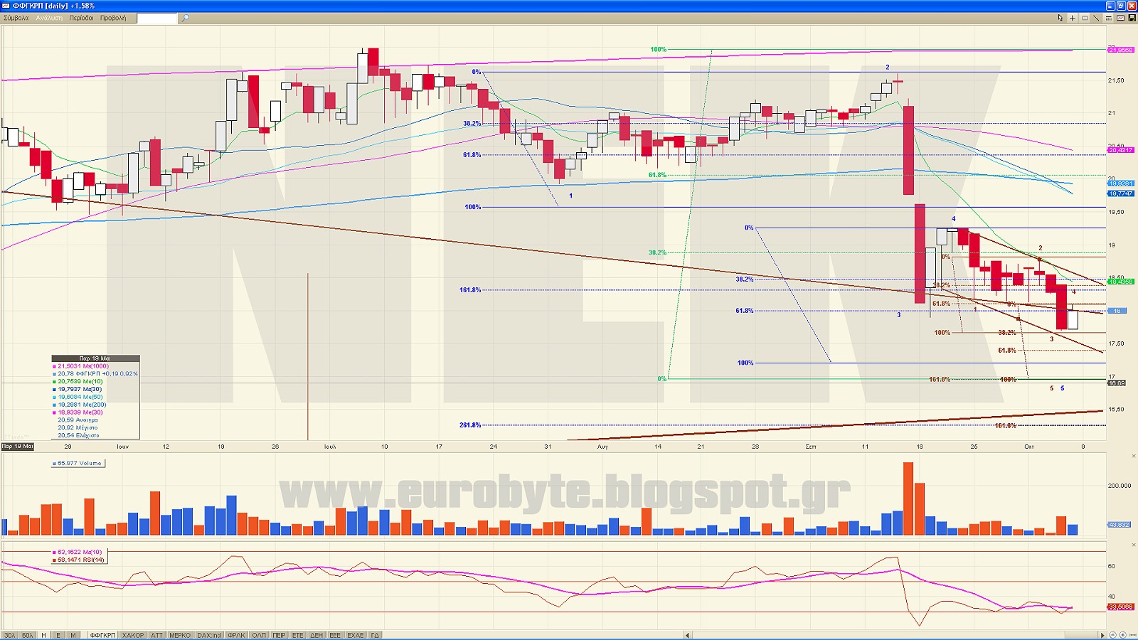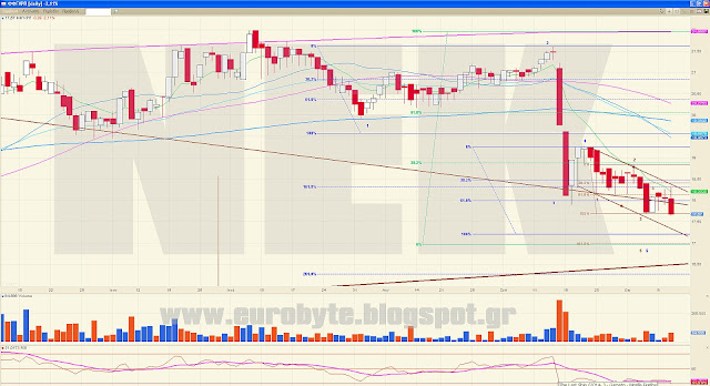 Το χαρτί με την εξωτερική μέτρηση έκανε μονοκόμματο 3 καθοδικό με αναλογία 161.8% του 1, αντίδραση 4 και τώρα στο 5 το οποίο το κάνει με εσωτερικό 5κυματικό σχηματισμό. Ηδη έχει κάνει το (1,2,3) του 5 με το (3 του 5) = 100% του (1 του 5). Σήμερα πραγματοποιεί μια μικρή αντίδραση την οποία δεν μπορούμε να τη θεωρήσουμε 4 ακόμη γιατί δεν ε΄χει γίνει το κλείσιμο. Το επίπεδο των 17.70 λογικά θα το χάσει γιατί το 3 δεν μπορεί να σταθεί στην ισότητα γιατι αν σταθεί εκεί, τότε το 5 θα πρέπει να κλειδώσει με την εξωτερική μέτρηση πάλι με ισότητα κοντά στο 17. Αρα λοιπόν το πιο πιθανό είναι να συνεχίσει καθοδικά το (3 του 5) και να τελειώσει με αναλογία 161.8% του 1 κοντά στο 17 δίνοντας με αναπήδηση ένα 4 και τελικά ένα 5 που θα καταλήξει στο ίσιο σημείο.