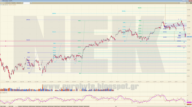 Ο DAX σήμερα έχει μεν πρώτο σημείο το 261.8% του 1 στις 12450 αλλά πιθανότερο σημείο στάσης και αντίδρασης είναι το 423% του 1 στις 11900 που αποτελεί και το 100% της διόρθωσης του τελευταίου ανοδικού, στόχο διπλής κορυφής με ισότητα και παράλληλα το 38.2% της διόρθωσης του τρέχοντος κύματος 3 (μπλε φίμπο)